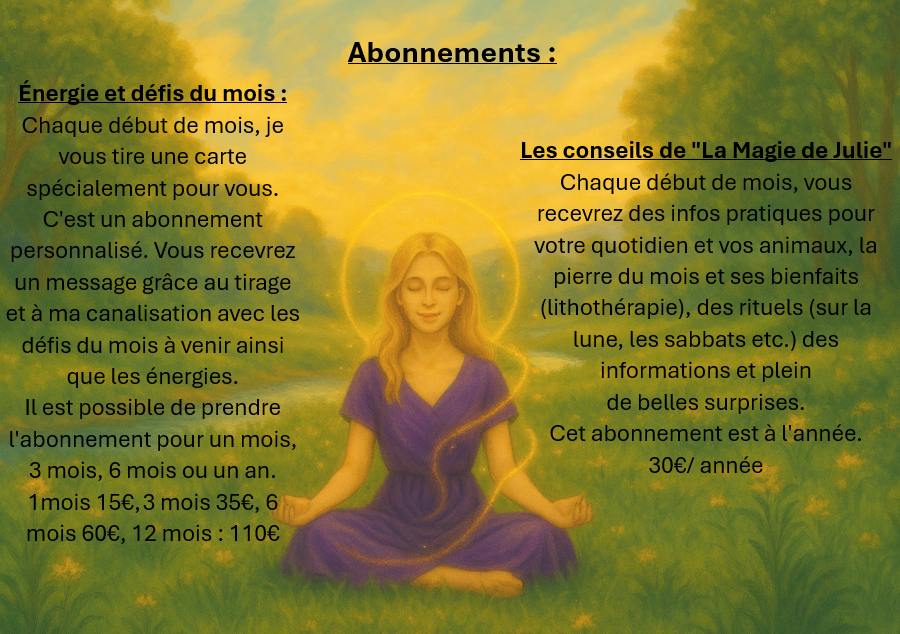 Pour recevoir votre message, vous pouvez prendre l'abonnement en contactant par mail : lamagiedejulie57@outlook.fr ou au 0744931968.